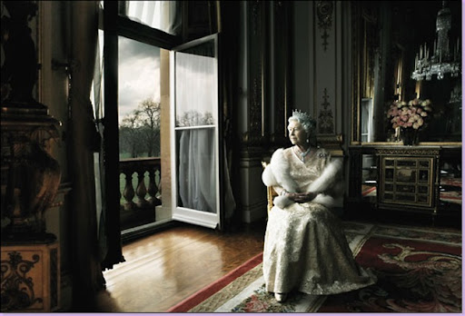 Contrast the above Leibovitz photograph with this one of the Queen in her royal robes taken by Calder. Leibovitz' pictures look like paintings rather than photos. Here, the Queen looks like she was just told a funny joke.