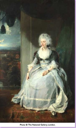 Another photo from the Leibovitz sitting. This one was inspired by the portrait of Queen Charlotte that hangs in the National Gallery in London (below). The room is regal enough, but the windows look like they were stolen from a government building.
