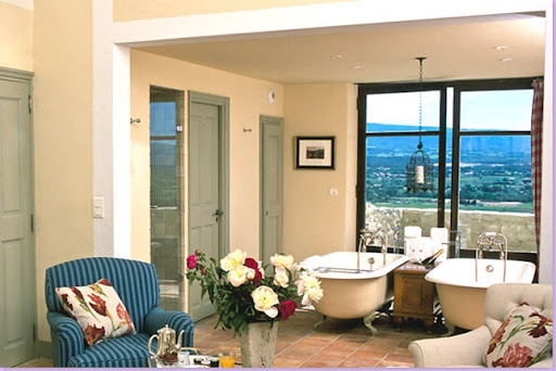 La Maison Reboul suite with matching tubs overlooking the valley and Mont Ventoux.