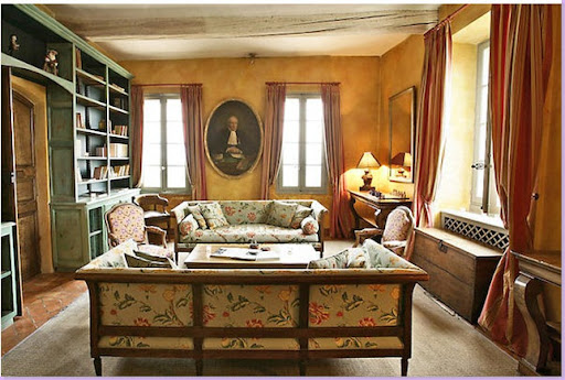A salon in the Maison Roche. I love the oval portrait on the back wall. The colors - terracotta and sage green are so beautiful together.