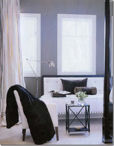The sitting area of the bedroom features an armless tufted sofa. The velvet trimmed silk taffeta draperies are from The Silk Trading Company.