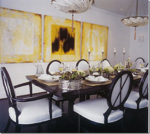 In the dining room, there is a huge change from the previous space. Totally contemporary now - the table is from Thomas O'Brien and the chairs are Barbara Barry. Two Fortuny lights, from Creative Flooring (owned by Abbott's husband) are overhead and the triptych by Ford Beckman grabs all the attention.
