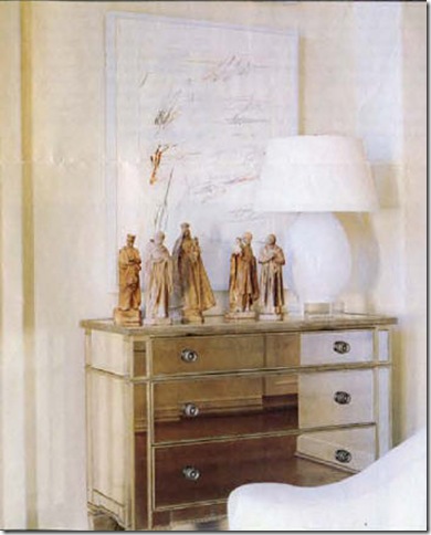 Close up of one of matching mirrored chests with the Cy Twombly above. Antique santos and milk glass lamp from AREA round out the tablescape.