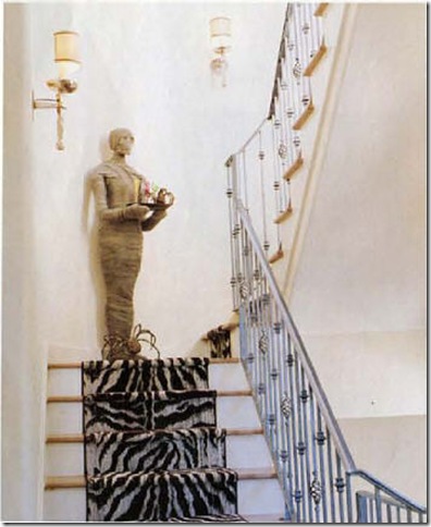 Abbott painted the iron staircase to resemble pewter. A mummy folly holds a tray of cordials. The runner is zebra patterned wool carpeting from Creative Flooring.