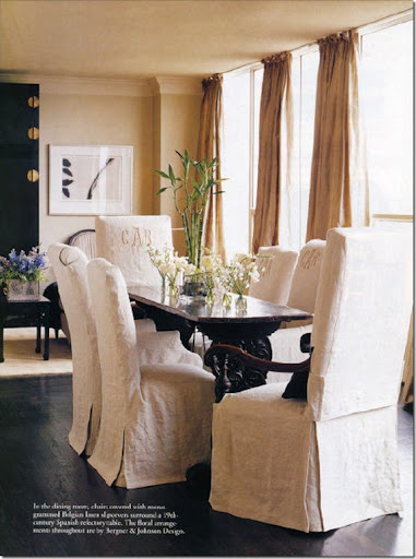 In this early Abbott apartment, the floors are a wonderful ebony color which pops all the white slipcovers. Here, Abbott brings three different sized chairs around the antique Spanish refectory table. Each slipcover is monogrammed in her oversized initials.