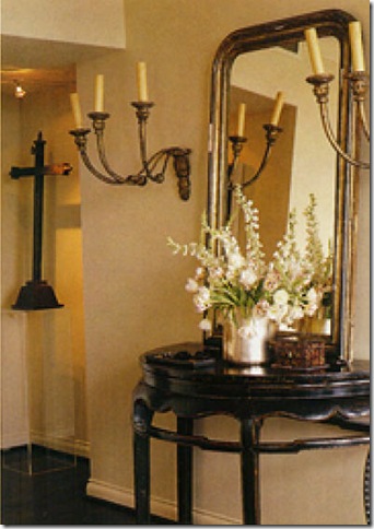 French antique mirror and sconces combined with an oriental demilune reside in the entry hall.